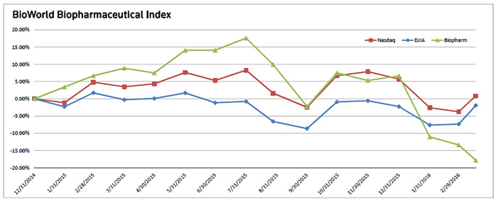 We are only a few days away from the end of the first quarter and it will certainly be a period that the biopharmaceutical sector will want to quickly forget. Year to date, the new BioWorld Biopharmaceutical Index, which combines group members from the BioWorld Blue Chip Biotech Index and BioWorld Pharma Index, has tumbled 23 percent – probably the sector's worst start to a year for almost 20 years. The volatile nature of the capital markets hasn't helped, but it hasn't benefited from a market recovery where most of the other sectors have bounced back from their lows. The Nasdaq Composite index is now only down 5 percent so far this year and the Dow Jones Industrial average has got back to even. (See BioWorld Biopharmaceutical Index, below.)