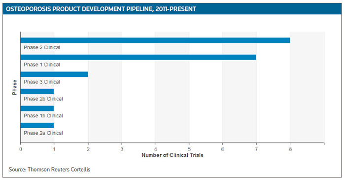 According to Cortellis Clinical Trials Intelligence, there are more than 60 trials currently recruiting patients for osteoporosis studies, including about 20 percent at the mid- to late trial stage. (See Osteoporosis Product Development Pipeline, below.)