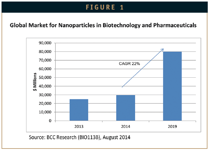 According to BCC Research (www.bccresearch.com), the global market for nanoparticles in the life sciences is estimated at over $29.6 billion for 2014. This market is forecast to grow to more than $79.8 billion by 2019, to register a healthy compound annual growth rate (CAGR) of 22%. The biggest increase will come in the area of drug delivery systems.