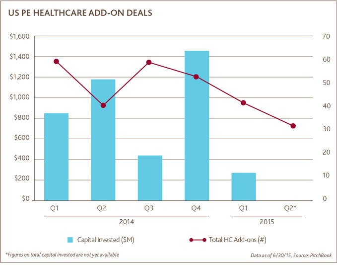 As private equity sponsors evaluate opportunities to grow their portfolios, many have also turned to add-ons during the past year, though they, too, experienced a small blip in the first two quarters of 2015. Q4 2014 saw 53 total add-on acquisitions in the healthcare industry, worth $1.45 billion in aggregate, and Q3 saw 59 total healthcare add-on deals close. That’s compared to 44 and 32 add-ons completed in Q1 and Q2 2015, respectively.