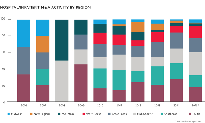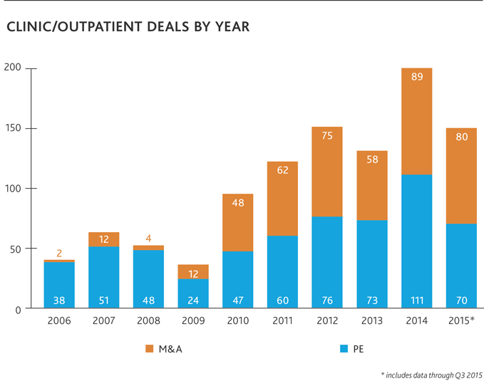 Private equity transactions in this space hit their highest level in a decade at $2.8 billion with 111 deals last year; the pace slowed only slightly this year with 70 deals valued at $1.4 billion hitting the books through the end of Q3. Non-private equity deals targeting clinics and outpatient services has maintained an aggressive pace as well, with 80 transactions recorded through the end of Q3, and compared with 89 deals for all of 2014.