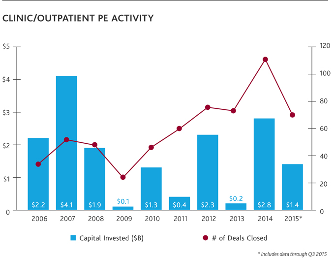 Update: While PE transactions in the clinic/outpatient space are still lagging slightly behind 2014, there has been forward progress since the end of Q3, with an additional five deals valued at $78.4 million through the end of October. Other, non-M&A clinic/outpatient deal activity has also continued since Q3, with seven new deals valued at $63.3 million in capital invested through Oct. 31.