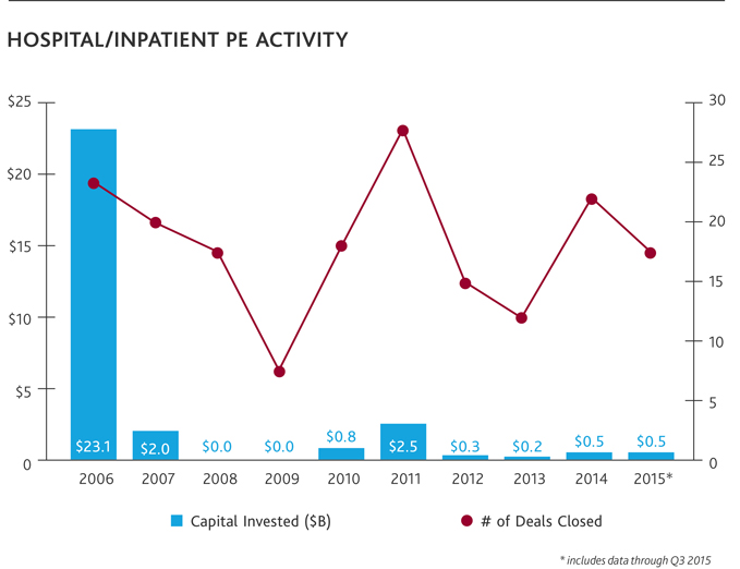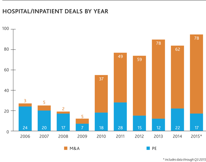 Meanwhile, deal activity in the hospital and inpatient services space has been trending upward, but excitement is much more subdued than on the outpatient side. Non-PE deals have skyrocketed since 2010: Only 37 deals (valued at $290 million) were recorded five years ago, compared with 78 deals through Q3 2015 valued at $4.5 billion—meaning on average, deal values increased more than seven times over. However, PE interest has remained relatively low. PE-related transactions hit a high of 28 in 2011, but have diminished since then, with 22 last year and 17 through Q3 this year.