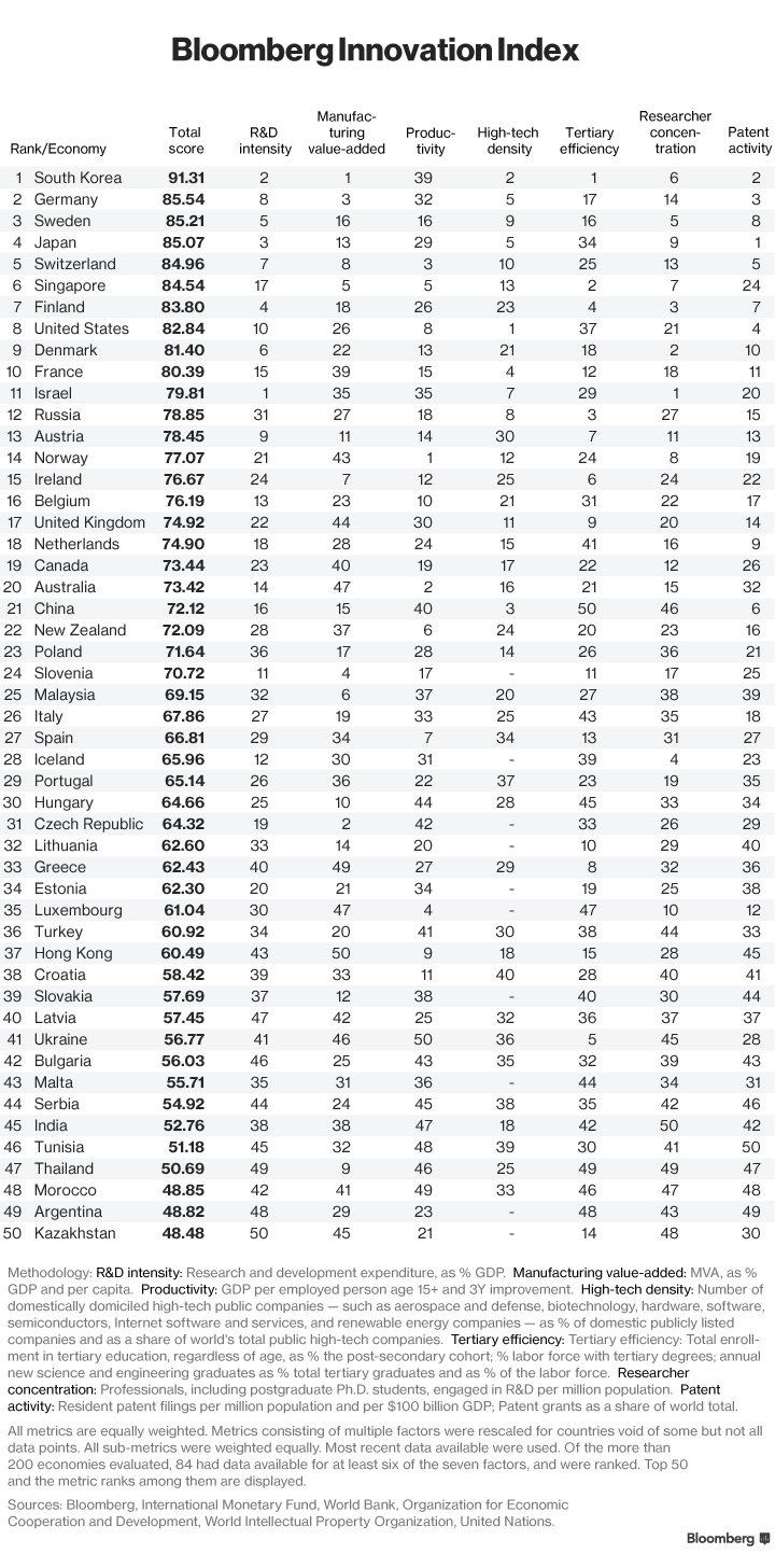 The ranking began with over 200 economies, from which those that didn't report data for at least six of seven categories measured were eliminated, trimming the list to 84. Bloomberg released overall and category scores for the top 50 innovative economies.