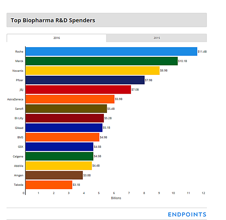The top five in the business saw their collective spending jump by more than $5 billion, from 2015 to 2016, based on the annual numbers filed largely — though not entirely — with the SEC and gathered by Endpoints News. Two of those companies, Roche and the new number 2, a hard charging Merck, accounted for the lion’s share of the increase. (To be sure, some onetime non-R&D spending, such as Merck’s patent settlement with Bristol-Myers on Keytruda, figured in. But so did bread and butter spending.)