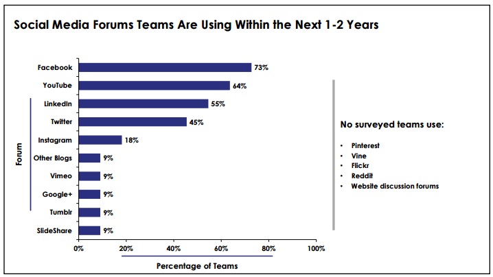 RESEARCH TRIANGLE PARK, NC--(Marketwired - August 09, 2017) - A new study of pharmaceutical marketing teams found that the most popular social media forum groups plan to use in the next one to two years is Facebook (73%), according to data published by business intelligence firm Cutting Edge Information.