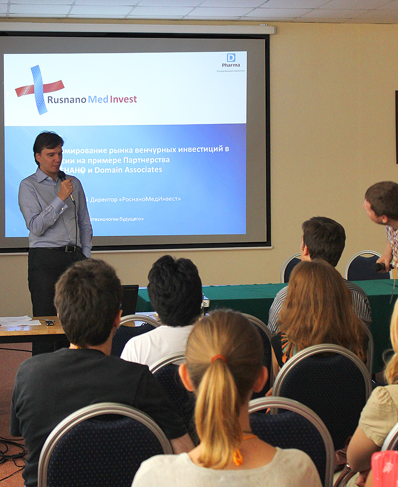 Он так же представил аудитории информацию о проекте, который реализует компания «РоснаноМедИнвест» в рамках соглашения ОАО «РОСНАНО» и крупной американской управляющей компании венчурными фондами Domain Associates.