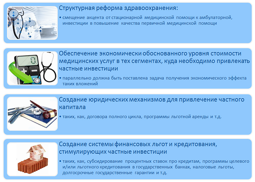 Государство так же может так же предпринимать определенные шаги по снижению себестоимости медицинских услуг, предоставляя, например, льготы по аренде помещений, по коммунальным платежам и т.д. Нужно так же продолжить работу по созданию юридических механизмов для привлечение частного капитала, развивать систему концессий, сформировать систему договоров полного жизненного цикла для привлечения долгосрочных инвестиций. Сейчас есть некий прообраз такого взаимодействия в Минтрансе при строительстве дорог. Можно повнимательнее изучить их опыт и посмотреть как он может быть применим при строительстве, например, крупных инфраструктурных объектов в здравоохранении.