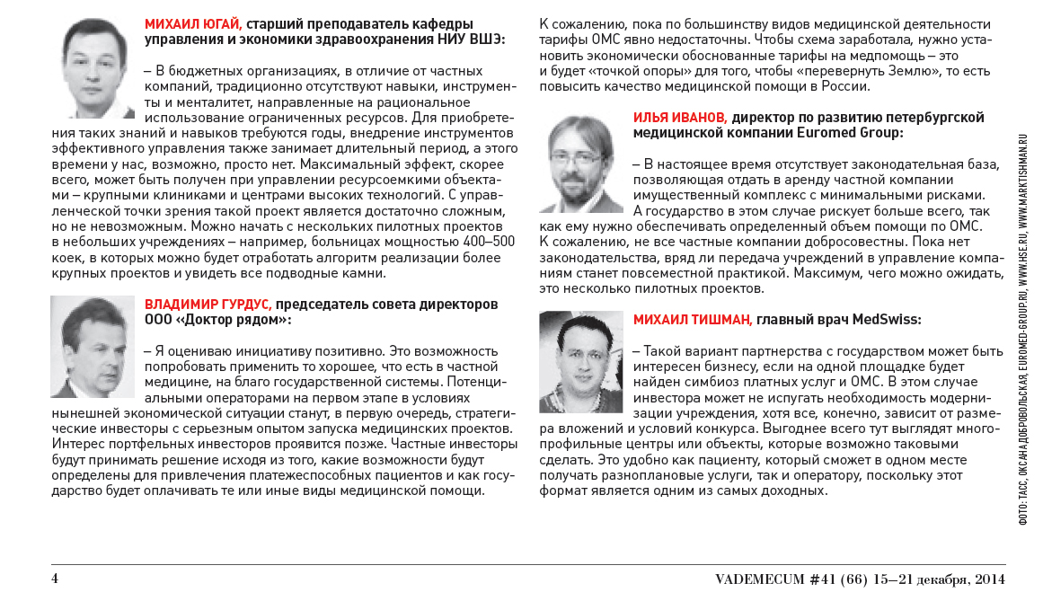 Минэкономразвития и Агентство стратегических инициатив разработали проект программы «Поддержка доступа негосударственных организаций к предоставлению услуг в социальной сфере». Управляющие компании для объектов здравоохранения будут отбираться по итогам конкурсов, первые из которых запланированы на ноябрь 2015 года. В «дорожной карте» также указан целый комплекс мер по совершенствованию системы ОМС и устранению препятствий для участия в ней частных компаний. VM выяснил у представителей частных медклиник и экспертов, способна ли программа стать катализатором медицинских ГЧП‑проектов.
