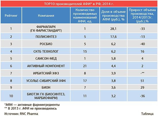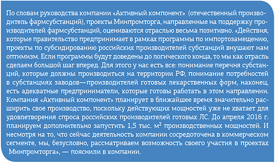 По информации Минпромторга, в настоящий момент в России более 30 предприятий-производителей ориентируются именно на производство субстанций для фармрынка. В рамках госпрограммы «Развитие фармацевтической и медицинской промышленности на 2013—2020 гг.» на рынок было выведено 13 ЛС, 10 из которых производятся в России из собственной субстанции. Объем продаж этих препаратов в 2014 г. составил 8,4 млрд руб. При этом в последнее время, как отмечает Сергей Цыб, в фармпромышленности наблюдается тренд на развитие направления биотехнологии.