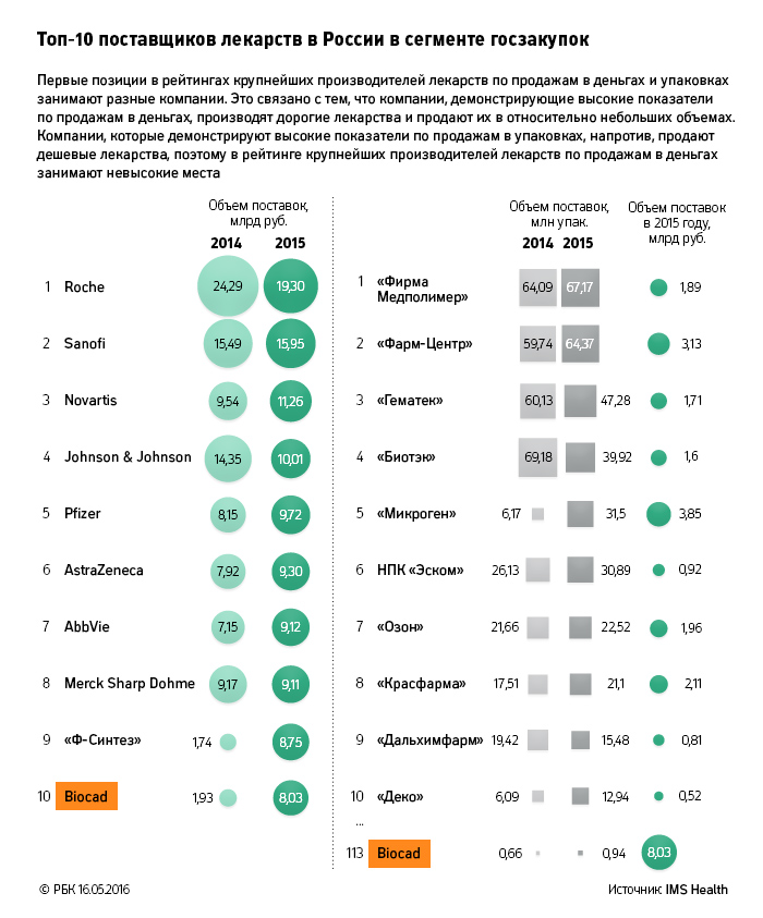 В 2015 году государственный сегмент рынка был, по данным IMS Health Russia, примерно вдвое меньше коммерческого: 308,3 млрд руб. против 631,7 млрд руб. (по данным DSM Group, 322,9 против 740,6 млрд руб. соответственно). Biocad будет владеть своим сегментом рынка госзакупок до тех пор, пока «государство будет закупать дженерики и выстраивать административные барьеры для иностранцев», считает заместитель гендиректора Stada CIS Иван Глушков. Это сектор с ограниченным числом пациентов и ограниченным финансированием, а стратегия государства может измениться, предупреждает он. Директор ГБУ НИИ организации здравоохранения и медицинского менеджмента департамента здравоохранения города Москвы Давид Мелик-Гусейнов, напротив, уверен, что госзакупки — «понятный, надежный сегмент», стабильный спрос в котором будет всегда.