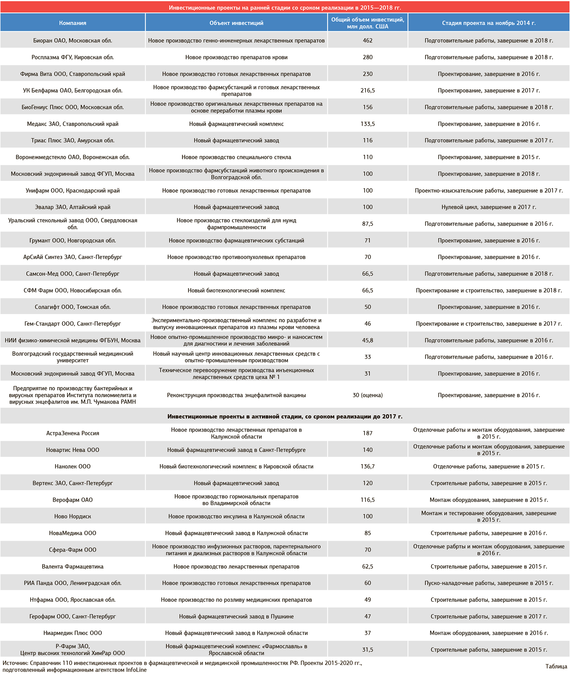 Гораздо более интересны планирующиеся проекты. В 2014 г. началось проектирование 20 новых фармпроизводств и модернизация двух площадок стоимостью выше 30 млн долл. США. Объем инвестиций в эти объекты составит 2,6 млрд долл. США.