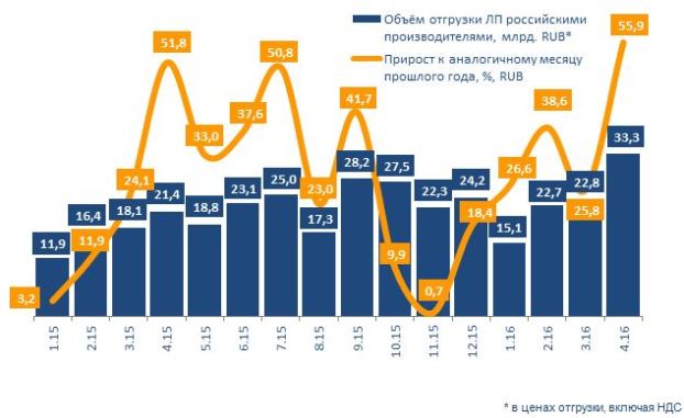 Динамика развития отечественных фармпроизводителей пока существенно опережает темпы ввоза импортных ЛП в нашу страну. В апреле 2016 г. российские компании отгрузили со своих складов продукции на общую сумму 33,3 млрд. руб. (в ценах отгрузки, с учётом НДС), динамика к аналогичному месяцу прошлого года составила рекордные 55,9%. Суммарно с начала года российские производители поставили ЛП собственного производства на сумму 93,9 млрд. руб. Динамика к прошлогодним показателям составила 38,5% при расчётах в рублях.