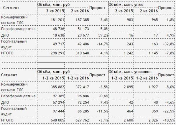 Падение потребления лекарственных препаратов (ЛП) в натуральном выражении наблюдается по всем сегментам рынка, в итоге за 6 месяцев было реализовано 2,3 млрд. упаковок лекарств, что на 10,5% ниже чем в 2015 году.