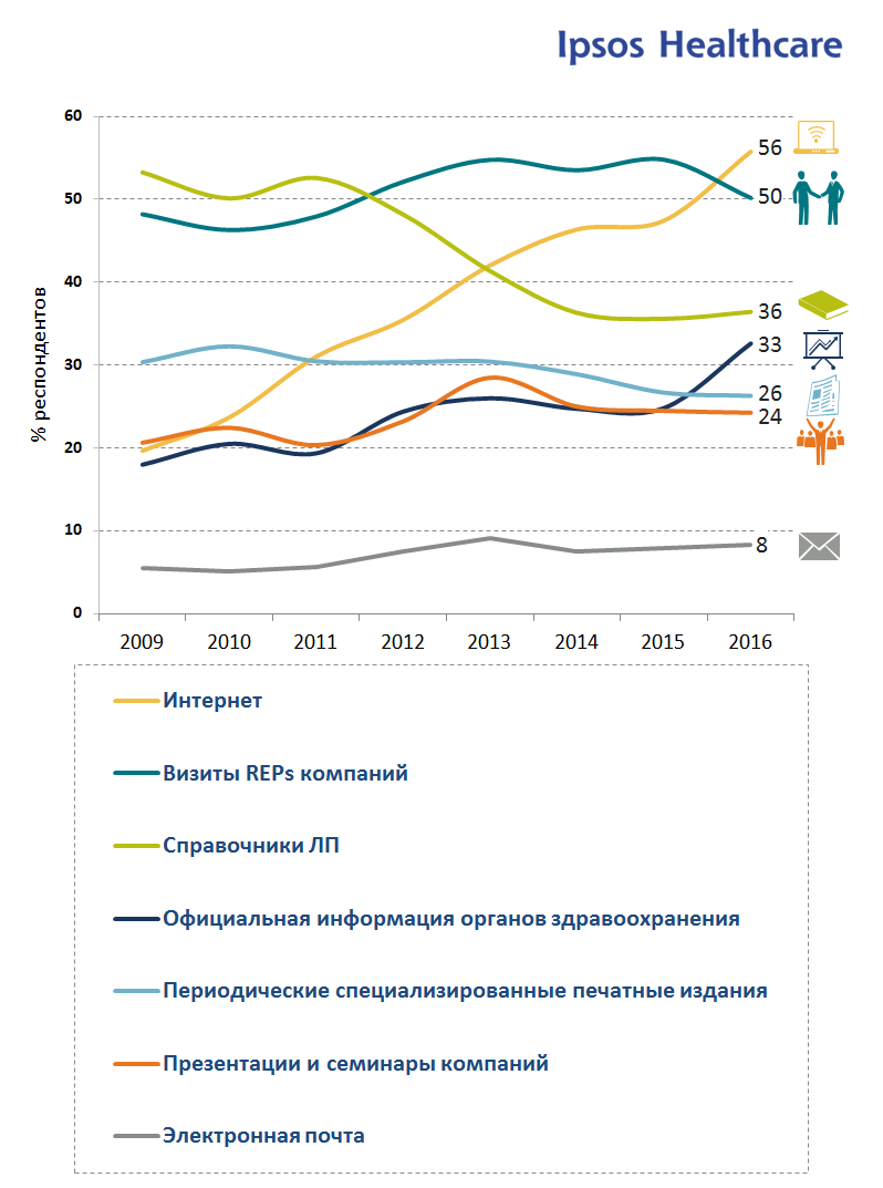Доля провизоров, рассматривающих интернет в качестве основного источника получения информации о лекарственных препаратах (56%), впервые превысила аналогичный показатель для визитов медицинских представителей (50%). Также следует отметить, что интернет является самым динамично растущим источником информации для провизоров. За последний год доля использующих его специалистов выросла на 8% по сравнению с аналогичным периодом 2015 г. (рисунок 1).