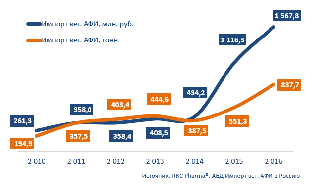 По итогам 2016 г. в Россию было завезено ветеринарных активных фармацевтических ингредиентов (АФИ) на общую сумму 1,57 млрд руб. (в ценах выпуска в свободное обращение). За год объeм поставок в рублeвом выражении вырос более чем на 40%. Правда, это далеко не максимальный показатель, годом ранее объeм ввоза подобной продукции продемонстрировал прирост почти на уровне 160%. Натуральный объeм импорта вет. АФИ в 2016 г. составил 837,7 тонны – на 52% больше, чем в 2015 г.
