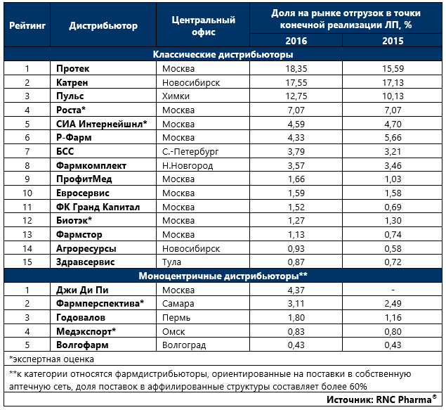В топе стремительно ротируются лидеры, в частности, в середине прошлого года первое место себе вернула компания «Протек», «Пульс» за несколько лет сделал почти невозможное – ворвался в тройку компаний-лидеров. Последние 2 года увеличение доли на 2-3% в год стало едва ли не нормой для отдельных компаний. Как следствие заметно выросла концентрация сегмента оптовой торговли, по итогам 2016 г. пятнадцать классических фармдистрибьюторов контролируют 81% рынка, за год доля крупнейших компаний выросла на 7,4%.